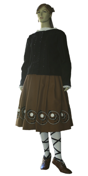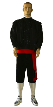 Blusa negra de tela brocada o de raso, muy entallada, abotonada en la parte delantera y rematada en la espalda con una “cola” en picos; adornada toda con puntillas negras en cuello, puños y parte trasera; enriquecida en el pecho y parte delantera con azabache y cordoncillo entrelazado de diversos colores.