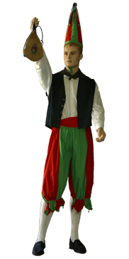 Pantalón bombacho en vistosos colores, fruncido bajo la rodilla y terminado en picos de donde cuelgan alegres cascabeles.