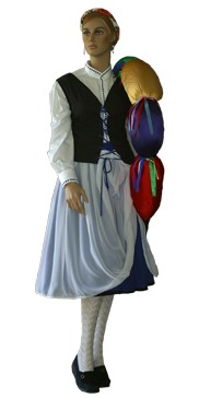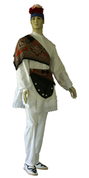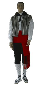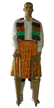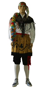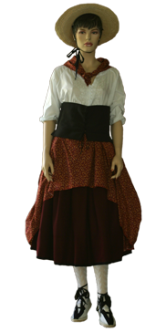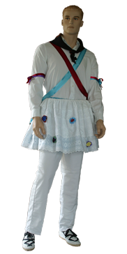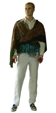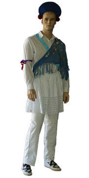 Sayuela, falda corta o "faldilla" sobre el pantalón de tela adornada de vistosos colores y rematada en flecos.