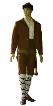 Traje en buriel marrón tabaco, con chaqueta corta de solapa pequeña y botonadura con trencillas.