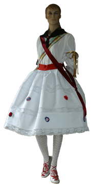 Enagüilla blanca corta rematada con puntillas y con escarapelas de vistosos colores.