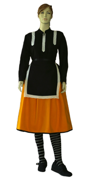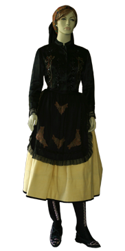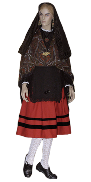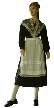 Delantal negro brocado o de raso, rematado en puntillas negras y con adornos de azabache.