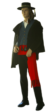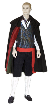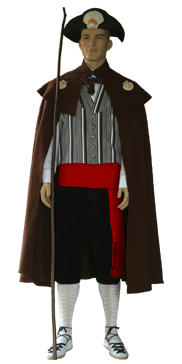 Capa larga parda o negra ribeteada de pasamanería, abierta por la parte trasera, forro de vistosos colores y capelina abotonada con rica pasamanería.