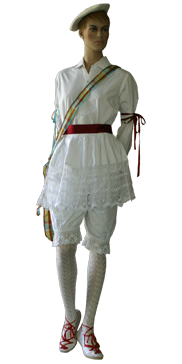 Bombacho o pololo blanco hasta la rodilla rematado con cinta de color y puntillas.